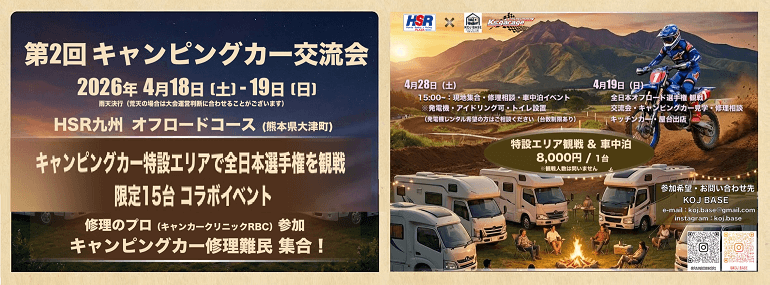 - 鹿児島・宮崎でのイベント「キャンピングカー交流会 in 道の駅くしま」宣伝も含め工具・道具を積み込み参加。多くのご相談有難うございました ( ^^)/